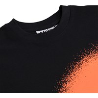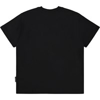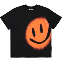 Zwart T-shirt gemaakt van zachte biologische katoen met een ribboord rond de hals. Het T-shirt heeft een ruimvallende pasvorm met een print van een oranje lachend gezicht.
