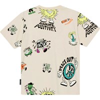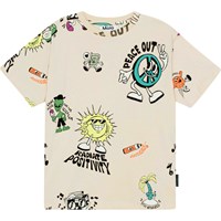 Gebroken witte t-shirt van 100% biologisch katoen met een kleurrijke print van grappige stripfiguren. Er is een grappige zon, een buitenaards wezen dat een ijsje eet, een dansende draagbare radio en nog veel meer. Het straalt allemaal een positieve zomersfeer uit. Het t-shirt heeft een ronde hals met ribboord en een ruimvallende pasvorm.