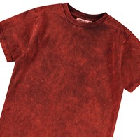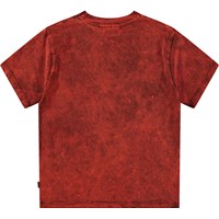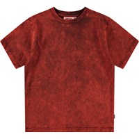 Rode t-shirt van biologisch katoen met korte mouwen en ribboord rond de hals. Het t-shirt heeft een ruimvallende pasvorm met een verwassen effect wat zorgt voor de verschillende kleuren rood.