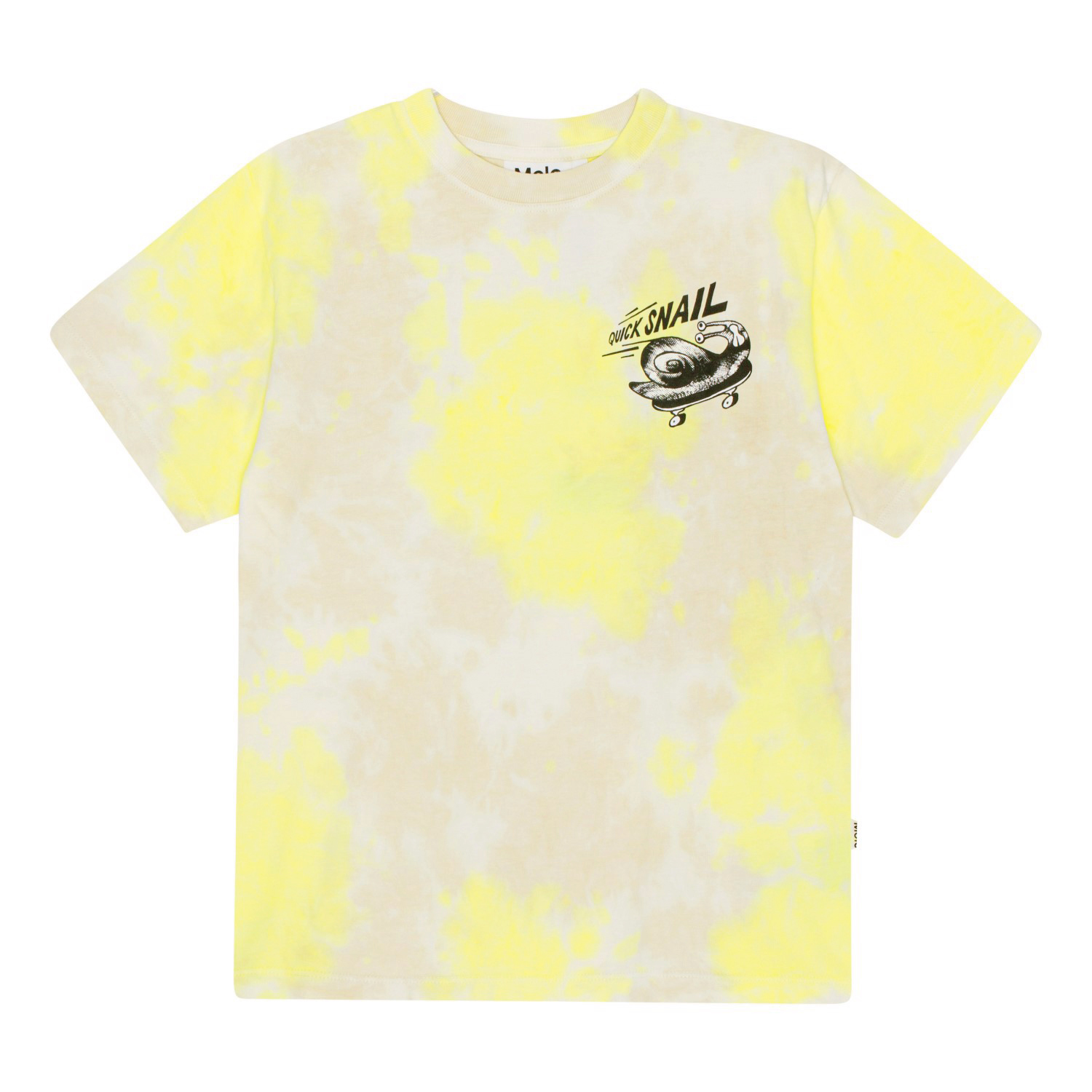 Rodney is een t-shirt van 100% biologisch katoen met een tie-dye print en een kleine print op de voorkant en een grote print op de achterkant. De print is van een stoere slak die de term 'slakkengang' een nieuwe betekenis geeft, terwijl hij op zijn skateboard zoeft. De print is een zwart/witte illustratie in cartoonstijl op een citrusgeel en zandkleurig tie-dye t-shirt. Rodney heeft een ronde hals met ribboord en een ruimvallende pasvorm. Als je een meer klassieke pasvorm wilt of als je kind tussen twee maten in zit, raden we je aan een maat kleiner te kiezen dan normaal. De tie-dye prints van Molo zijn uniek en met de hand gemaakt, waardoor de print per stijl kan verschillen.
