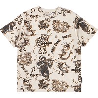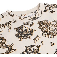 Beige T-shirt van biologisch katoen met een ribboord rond de hals. Het T-shirt heeft een ruimvallende pasvorm met een print van een dieren die muziek maken.