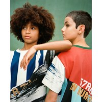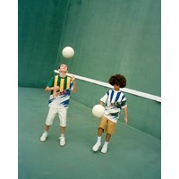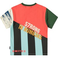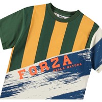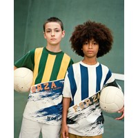 Groen t-shirt van biologisch katoen met korte mouwen en ribboord rond de hals. Het t-shirt heeft een ruimvallende pasvorm en een stoere print geïnspireerd op de voetbalwereld.