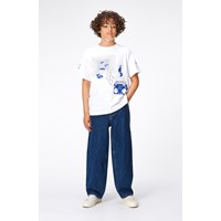 Rodney is een wit t-shirt van 100% biologisch katoen met een blauwe print. De print is in een monochromatische collagestijl met een muzikaal thema, waaronder een draagbare speaker, breakdancers, vinylplaten en een stoere ruimteraster. Rodney heeft een ronde hals met een ribboord. Dit model heeft een ruimvallende pasvorm. Als je een meer klassieke pasvorm wilt, of als je kind tussen twee maten in zit, raden we je aan een maat kleiner te kiezen dan normaal.