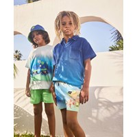 Oversized t-shirt van biologisch katoen met korte mouwen en ribboord rond de hals. Het t-shirt is lichtblauw met een print van leuke kinderherinneringen.