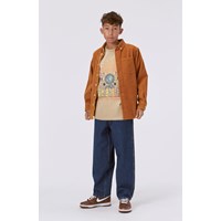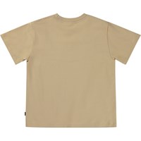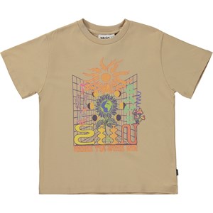 Beige t-shirt met op de voorkant een print. Dit is een grafische en kleurrijke print van de planeet Aarde in het midden van een zonnebloem die wordt omringd door verschillende fasen van de maan en een zon aan de bovenkant. Als je goed kijkt, zie je dat de vlammen van de zon "Under" spellen, en als je blijft lezen, zie je de boodschap "Under the same Sun". Dit t-shirt is gemaakt van 100% katoen, heeft korte mouwen, een ronde hals met rib en heeft oversized pasvorm.