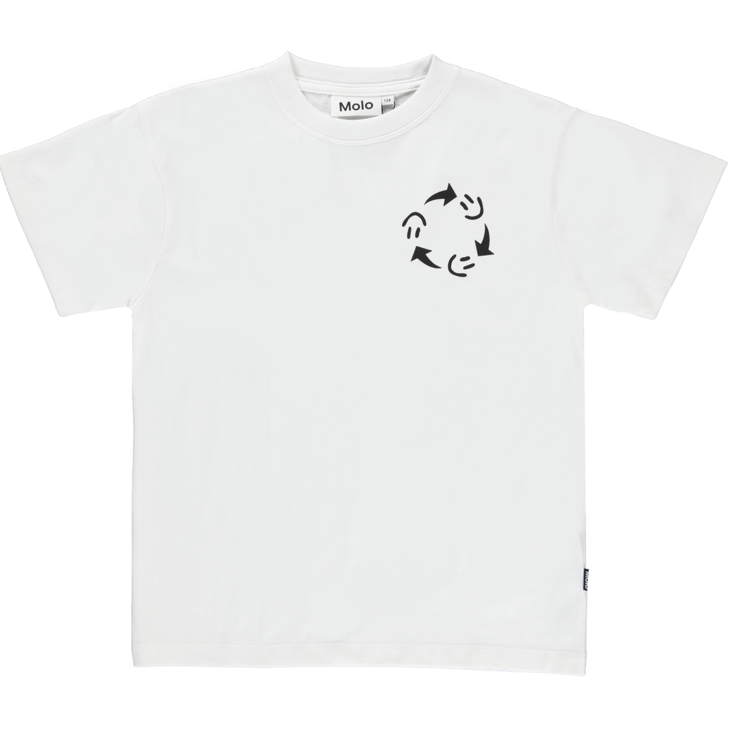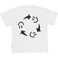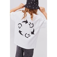 Rodney is een wit t-shirt met aan de linkerzijde en op de achterkant een print van smileys die in cirkels rondgaan. Glimlach naar de wereld en de wereld lacht terug. Het t-shirt heeft een ruimvallende oversized pasvorm.