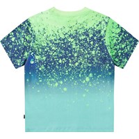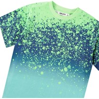 Oversized t-shirt van biologisch katoen met korte mouwen en ribboord rond de hals. Het t-shirt is blauw met een mintgroene spattenprint.