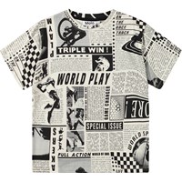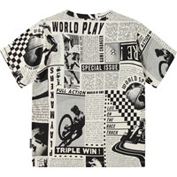 Zwart en gebroken wit t-shirt van biologisch katoen met een ronde hals en geribbelde boord rond de hals. Het t-shirt heeft een oversized pasvorm en een all-over print. De print is een zwart witte krantenknipsel met afbeeldingen en artikelen over verschillende sporten.