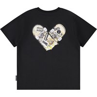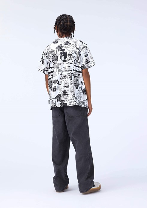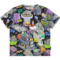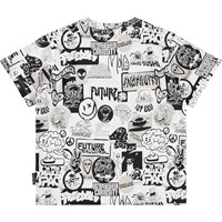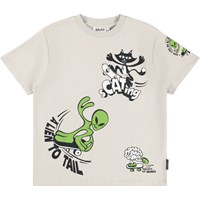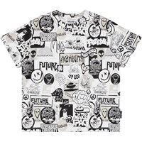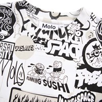 Wit t-shirt gemaakt van zacht biologisch katoen met een ribboord rond de hals. Het t-shirt heeft een oversized pasvorm met meerdere prints van zwarte, witte en beige stickers met leuke en schattige uitspraken over het leven en de collectie van Molo.