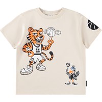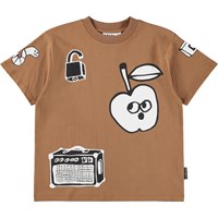 Bruin T-shirt van biologisch katoen met een ribboord rond de hals. Het T-shirt heeft een ruimvallende pasvorm met leuke zwart-witte prints.