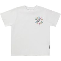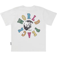 Wit t-shirt met op de achterkant een print van een radarbeeld van de Aarde, omringd door verschillende kleurrijke letters die “World Peace” vormen. Een kleinere versie van die print staat op de voorkant van de borst. Dit t-shirt is gemaakt van 100% katoen, heeft korte mouwen, een ronde hals met rib een oversized pasvorm.