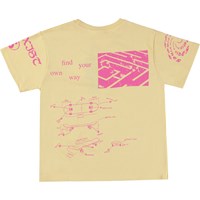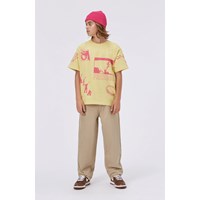 Geel t-shirt met een roze print, geïnspireerd op de skaterwereld. Dit t-shirt heeft grafische elementen zoals foto's, specificatietekeningen, symbolen en korte teksten die allemaal samen een grafische collage vormen. Dit t-shirt is gemaakt van 100% biologisch katoen, heeft korte mouwen, een ronde hals met een ribboord en een oversized pasvorm.