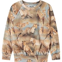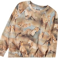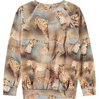 Sweater van zacht biologisch katoen met ribboord rond de hals. De sweater heeft een ruimvallende pasvorm met raglan mouwen en ribboord rond de mouwen en onderkant. Het is in verschillende kleuren bruin en blauw met een all over pritn van rennende cheeta's.
