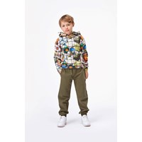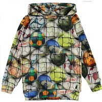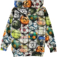 Romo is een hoodie met een buidelzak en een print van kleurrijke voetballen achter een net.