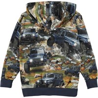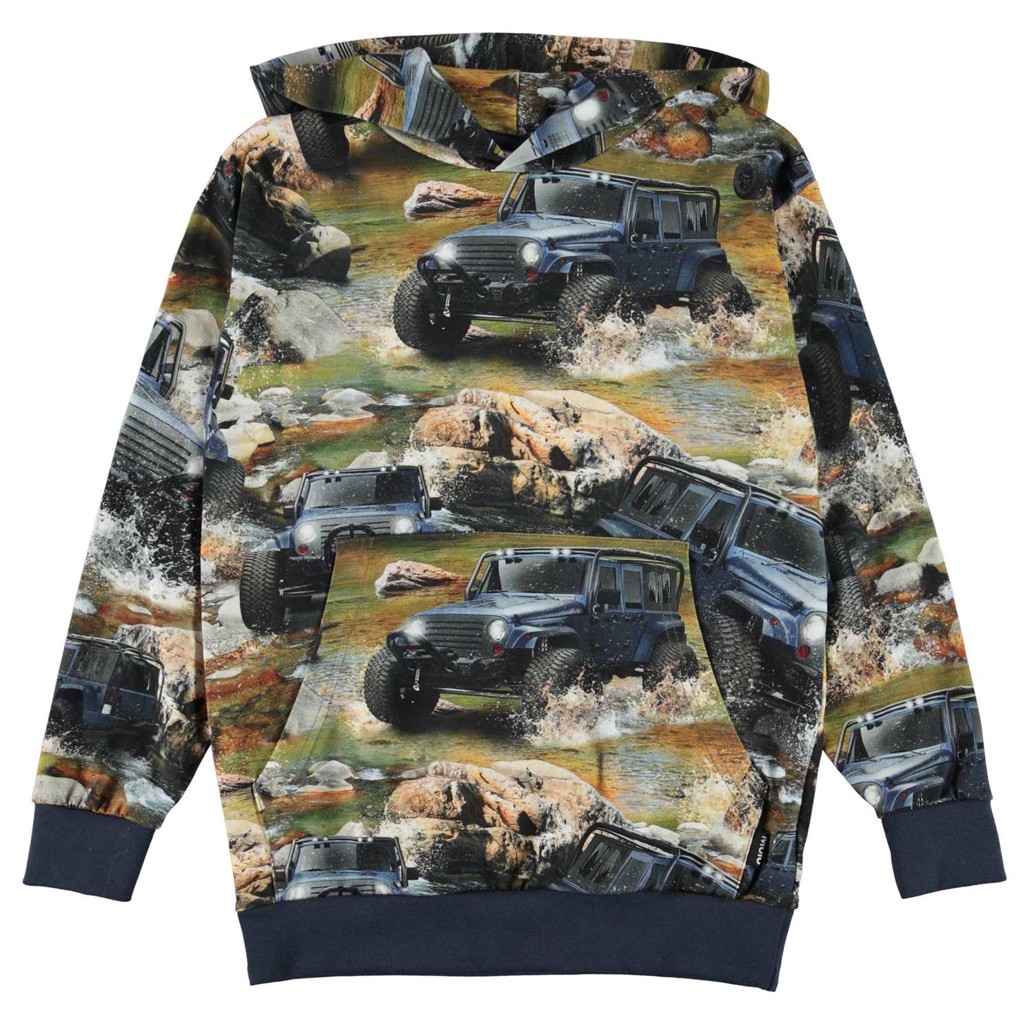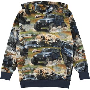 Romo is een hoodie met een print van jeeps. De hoodie heeft aan de voorkant een buidelzak.
