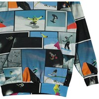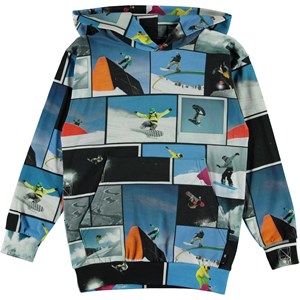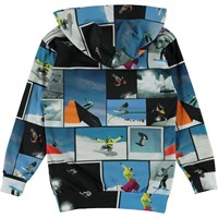 Romo is een blauwe hoodie met een print van stoere snowboarders. Het heeft een buidelzak aan de voorkant.