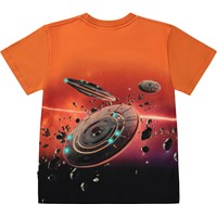 Oranje t-shirt met op de voor- en achterkant een print. Op de print staat een ruimteschip en UFO's die proberen te vliegen rond een asteroïdengordel in het heelal. Dit t-shirt is gemaakt van 100% katoen, heeft korte mouwen, een ronde hals met rib en een normale pasvorm.