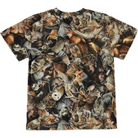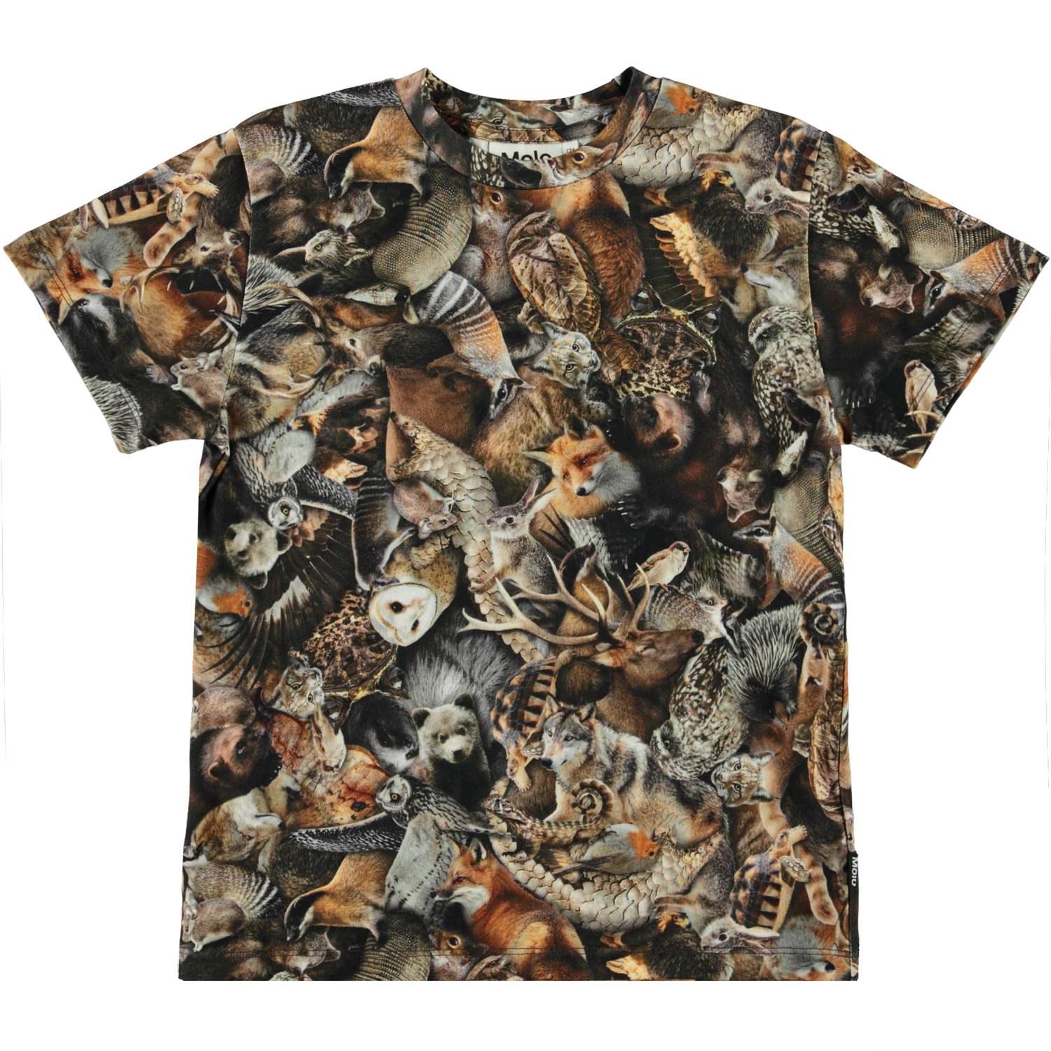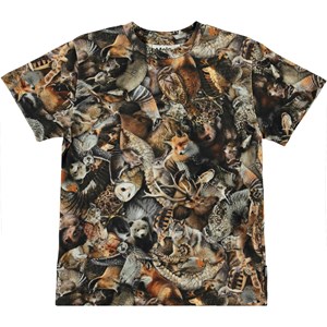 Roxo is een t-shirt in verschillende tinten bruin met een gehele print van verschillende bosdieren.