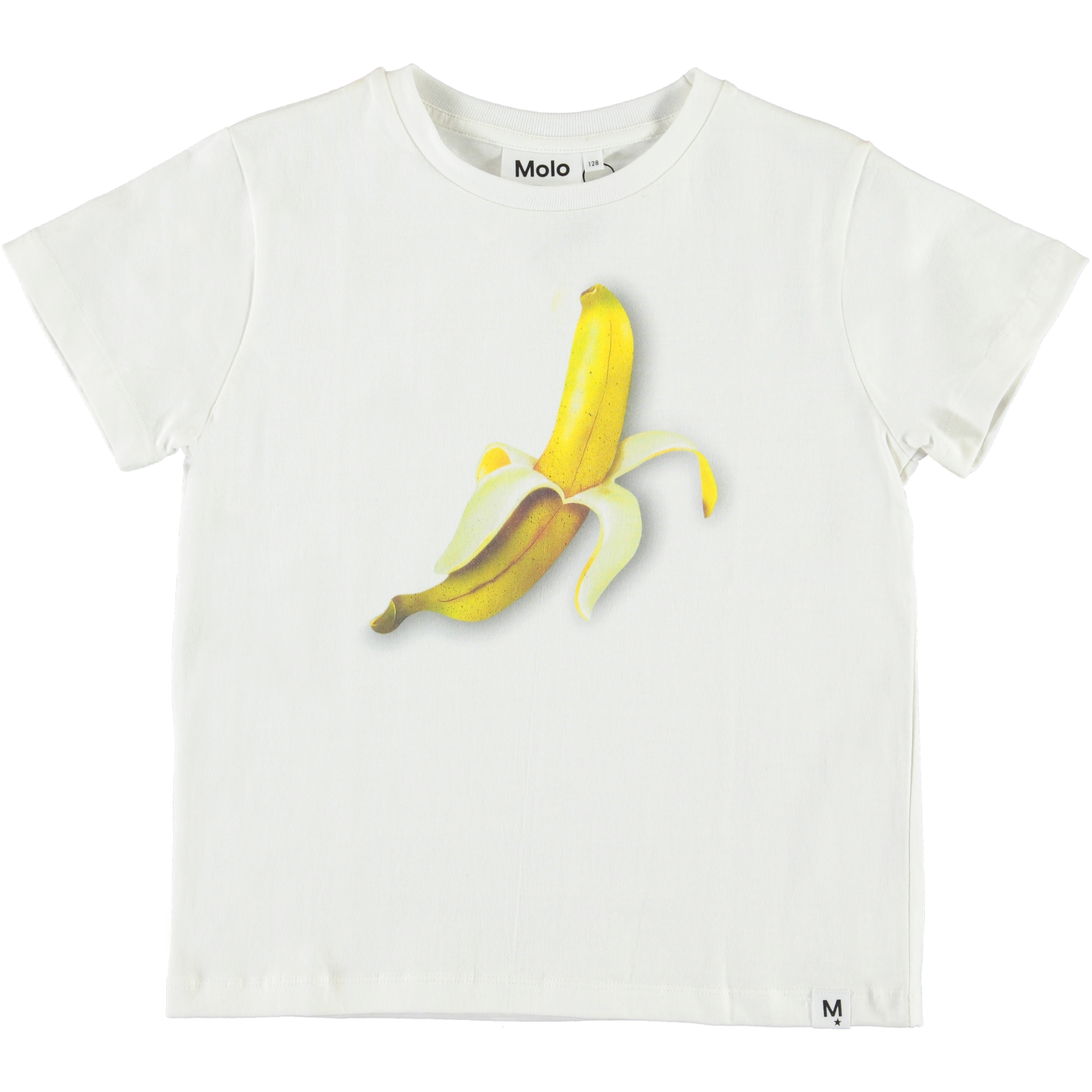 Roxo is een wit t-shirt met een bananenprint. Het t-shirt is 100% katoen en heeft korte mouwen.