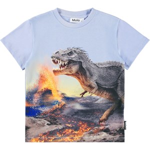 Lichtblauw t-shirt gemaakt van zacht biologisch katoen met een ribboord rond de hals. Het t-shirt heeft een ruimvallende pasvorm met aan de voorkant een print van een tyrannosaurus en spuitende vulkanen.