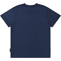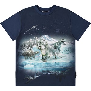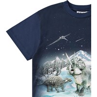 Donkerblauw t-shirt van biologisch katoen met ronde hals, geribbelde boord rond de hals in een normale pasvorm. Het heeft een print op de voorkant, waar alle Dino vrienden verzameld zijn in de sneeuw bij het koude water. Wie denk jij dat als eerste een sneeuwbal zal gooien?