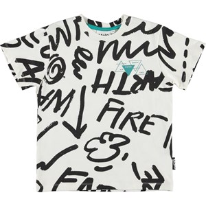 Roxo is een witte t-shirt met een print in het zwart van tekst en symbolen van de vier elementen.