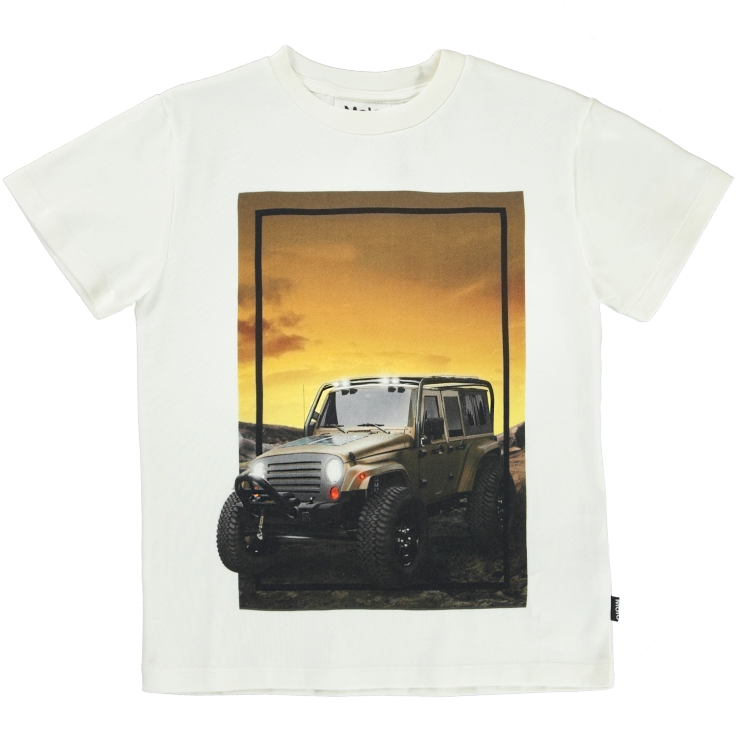 Roxo is een wit t-shirt met op de voorkant een print van een jeep. Het t-shirt heeft korte mouwen en een ronde hals.