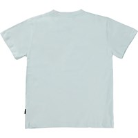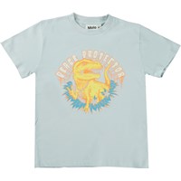 Roxo is een lichtblauw t-shirt met een print van een dinosaurus en de tekst ‘Peace protector’.