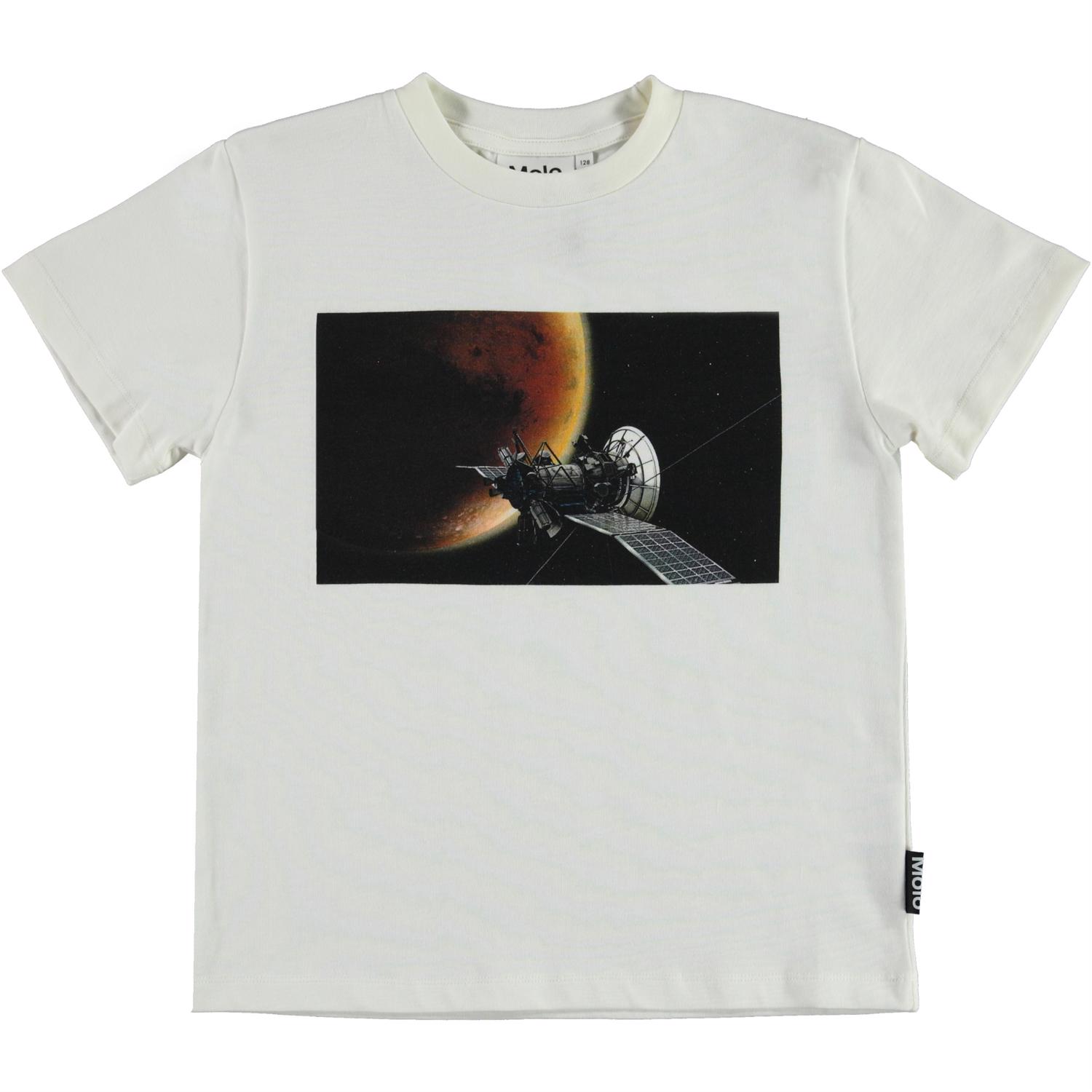 Roxo is een witte t-shirt met een print van satellieten die rond Mars vliegen.