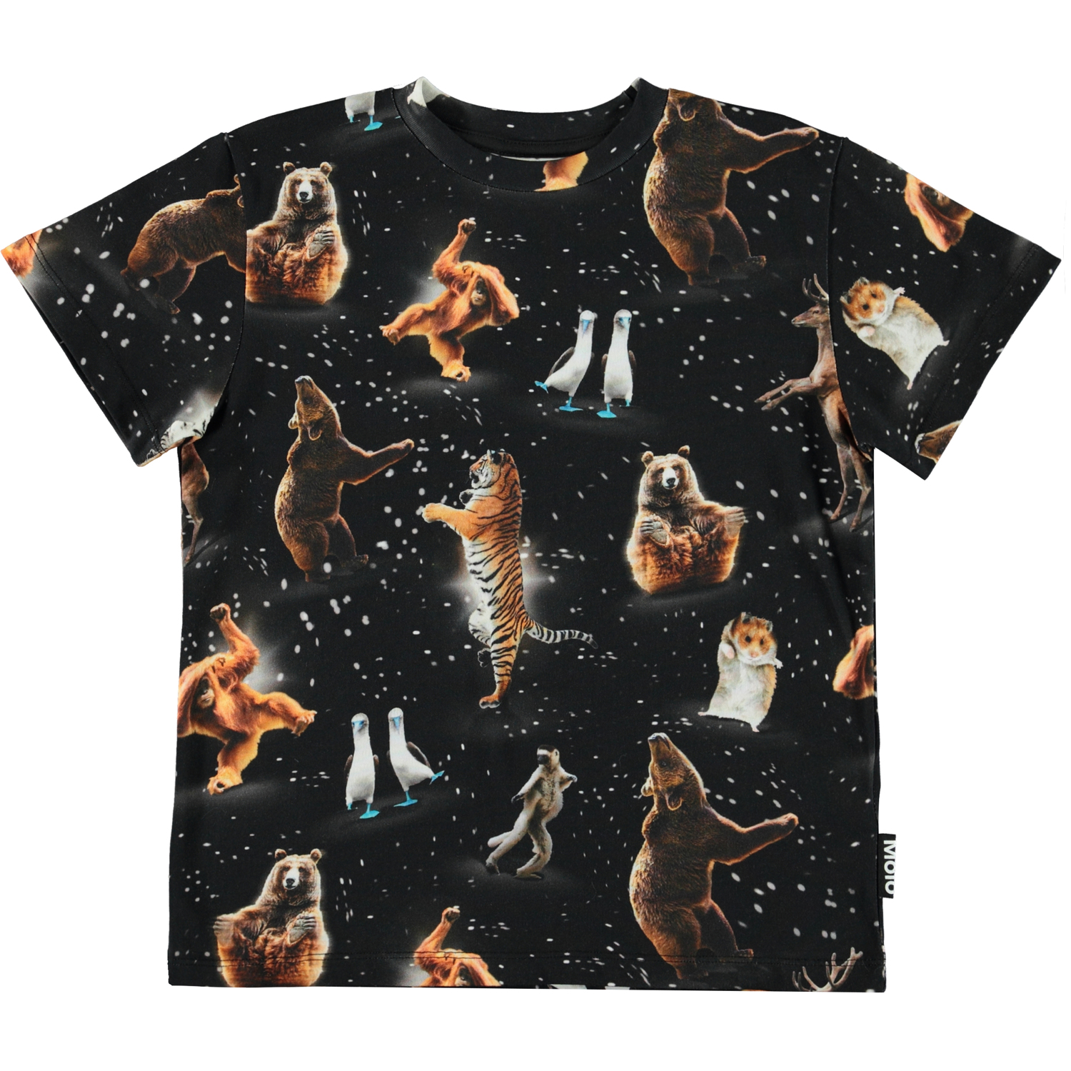 Roxo is een zwart t-shirt met een print van verschillende feest vierende dieren. De beer, de blauwvoetgenten, de tijger, de aap en vele andere dieren dansen de longen uit hun lijf.