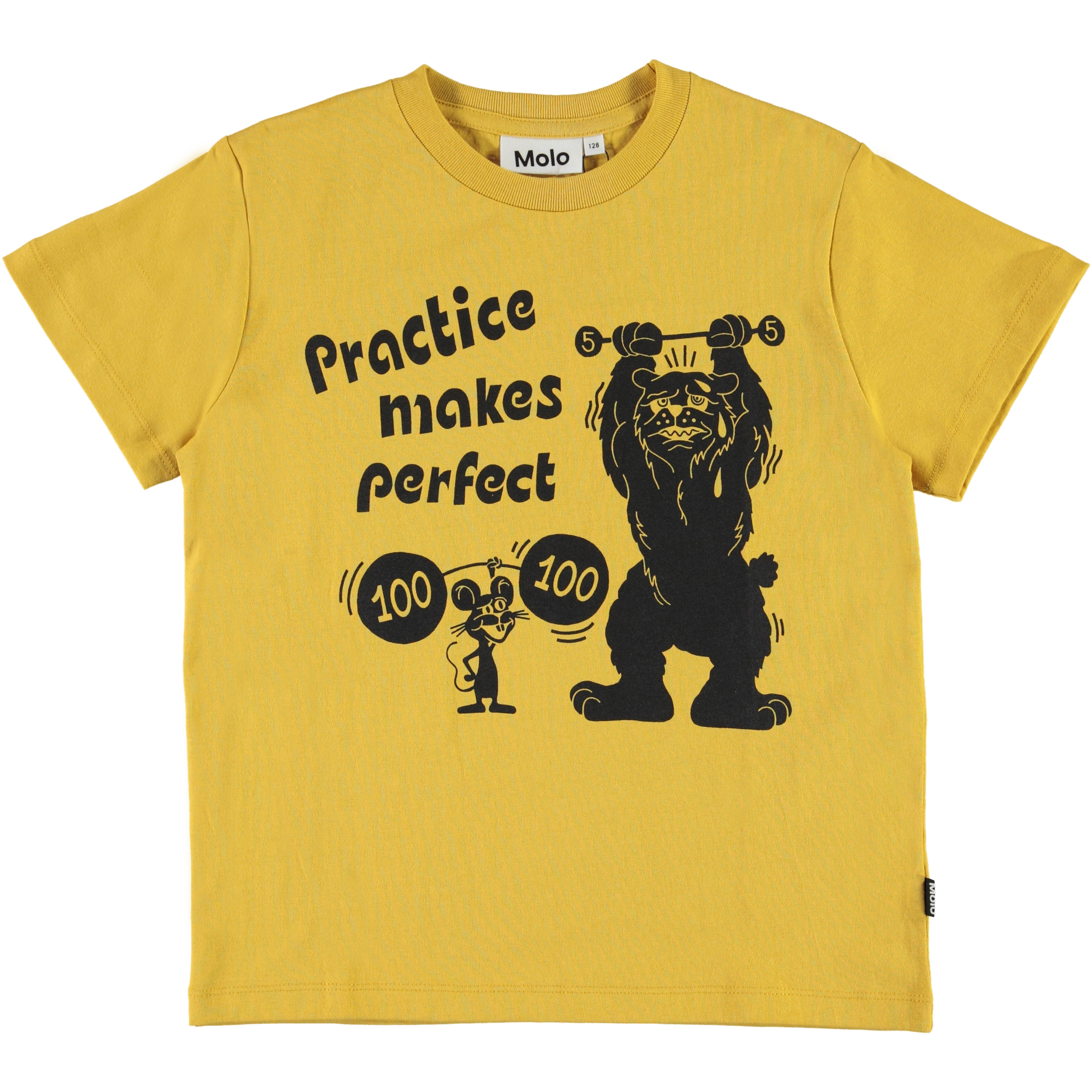 Roxo is een geel t-shirt met een humoristische print van twee dieren gewichtheffen en de tekst ‘Practice makes perfect’.