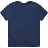Donkerblauw t-shirt van biologisch katoen met een ronde hals en geribbelde boord rond de hals. Het heeft een normale pasvorm en een print op de voorkant. De print is in beige tinten en toont een poema op jacht naar een avondsnack.