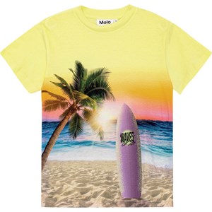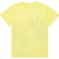 Roxo is een gele t-shirt van 100% biologisch katoen met op de voorkant een print van de oceaan, gezien vanaf de kustlijn van het strand met palmbomen en een surfplank op de voorgrond. Roxo heeft een ronde hals met ribboord en een normale pasvorm.