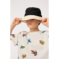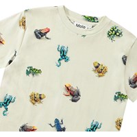 Gebroken wit t-shirt van biologisch katoen met korte mouwen en ribbord rond de hals. Het t-shirt heeft een ruimvallende pasvorm en een all over print van kleurrijke kikkers.