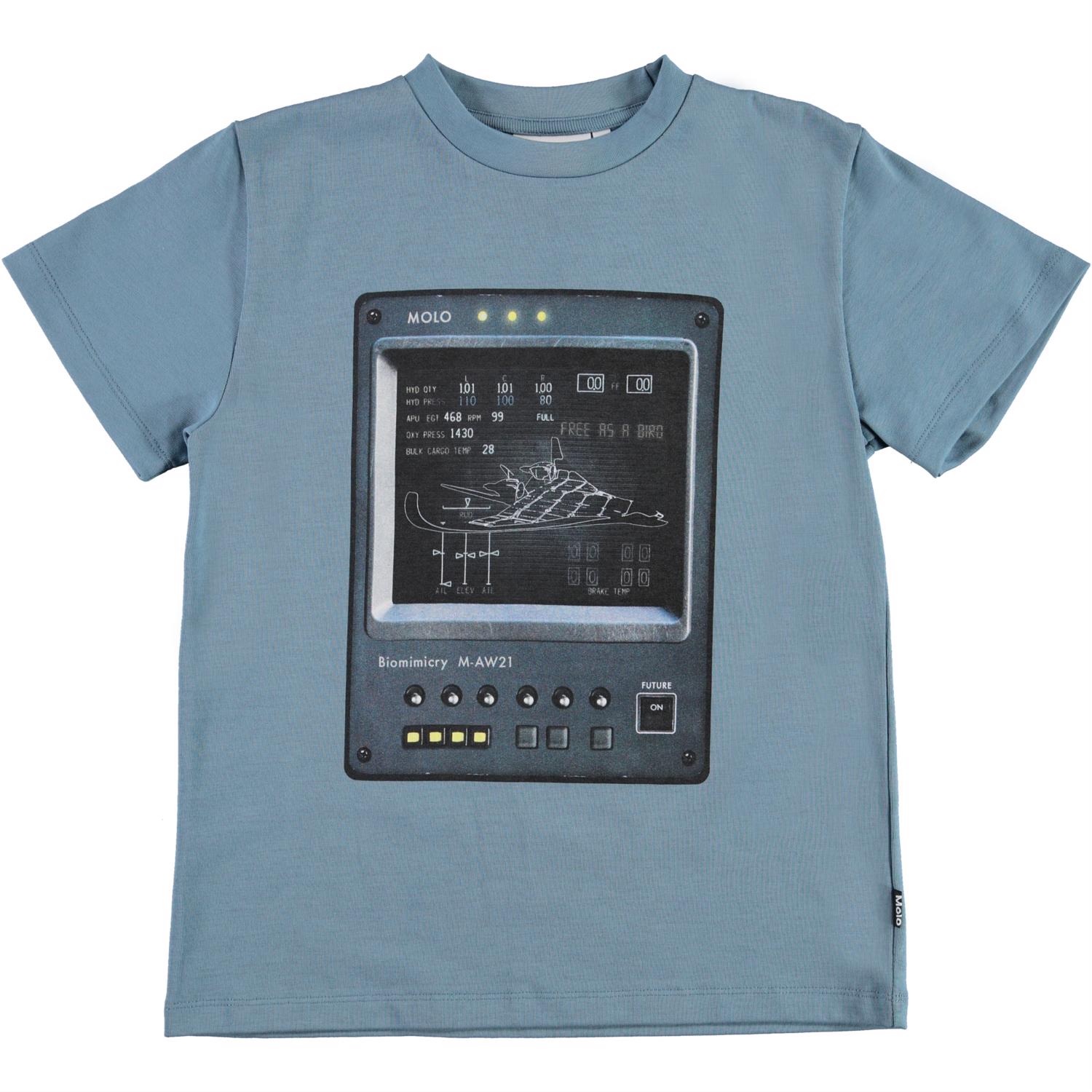 Roxo is een blauwe t-shirt met een print van de cockpit van een ruimtevaarschip.