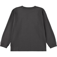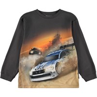 Grijze longsleeve gemaakt van zachte biologische katoen met ribboorden rond de hals en mouwen. De longsleeve heeft een ruimvallende pasvorm met een print van twee raceauto's op hoge snelheid.
