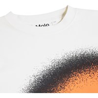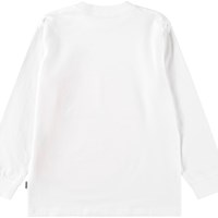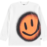 WItte longsleeve gemaakt van zachte biologische katoen met ribboorden rond de hals en mouwen. De longsleeve heeft een ruimvallende pasvorm met op de voorkant een oranje lachend gezicht.
