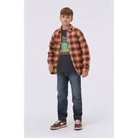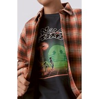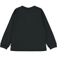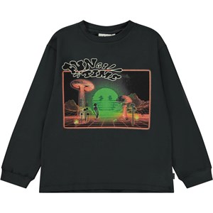 Zwarte longsleeve met op de voorkant een print. Op deze print kijk je naar een wereld ontwikkeld door de computer met 3D-bergen en een groene smiley met een hapering op de achtergrond. Er groeien enorme paddenstoelen naast kleinere, gloeiende paddenstoelen. Deze print verbindt de digitale wereld met de echte natuur en laat zien dat die twee veel gemeen kunnen hebben. Deze longsleeve is van 100% katoen, heeft een ronde hals met een ribboord en een ribboord aan de mouwen. Het heeft een ruimvallende pasvorm. Voor een coole laagjes look draag je er een t-shirt met korte mouwen overheen.