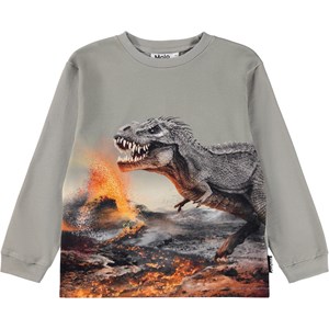 Kaki longsleeve top gemaakt van biologisch katoen met een ribboord rond de hals en mouwen. De longsleeve heeft een ruimvallende pasvorm met een print van een tyrannosaurus en een uitbarstende vulkaan.