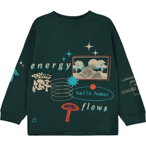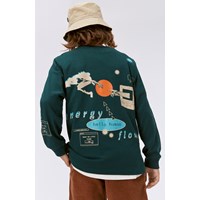 Donkergroene longsleeve met een print. De print is een grafische collage, geïnspireerd op de vage grenzen van de echte wereld en de wereld die je online vindt. ”Energy Flows” verkent eerder de overeenkomsten dan het contrast tussen deze twee werelden. Je kunt elementen vinden die zijn geïnspireerd op computergraphics, zoals pop-up vensters, 3D-schetsen, maar ook afbeeldingen van echte bomen. Deze longsleeve is van 100% katoen, heeft een ronde hals met een ribboord en ribboord aan de mouwen. Het heeft een ruimvallende pasvorm. Voor een coole laagjes look draag je het onder een t-shirt met korte mouwen.