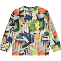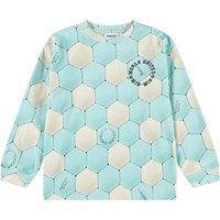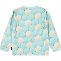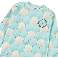 Longsleeve van biologisch katoen met ribboord rond de hals en mouwen. De longsleeve heeft een ruimvallende pasvorm en een all over print van het patroon van een voetbal in de kleuren blauw en beige.