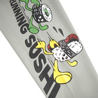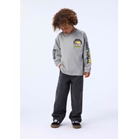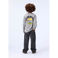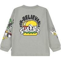 Grijze longsleeve van biologisch katoen met een ribboord rond de hals en mouwen. De longsleeve heeft een ruimvallende pasvorm met een kleurrijke print van levendig voedsel en grappige uitspraken.