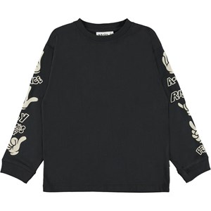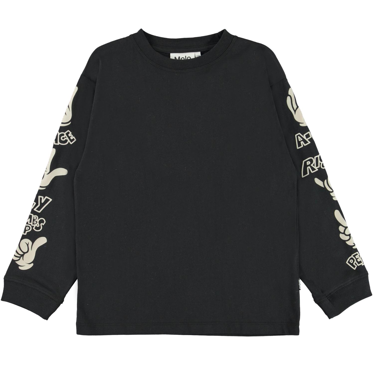 Rube is een zwarte sweater met ene print van verschillende handsignalen op de mouwen.