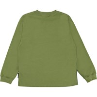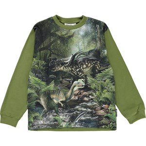 Rube is een groene sweater met op de voorkant een print van een dinosaurus.