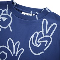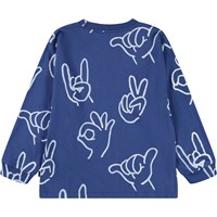 Blauwe longsleeve top gemaakt van biologisch katoen met een ribboord rond de hals en mouwen. De longsleeve top heeft een ruimvallende pasvorm met een print van schattige en grappige handgebaren.