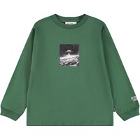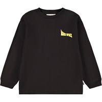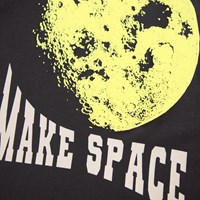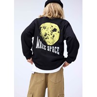 Zwarte longsleeve gemaakt van biologisch katoen met een ribboord rond de hals en mouwen. De longsleeve heeft een ruimvallende pasvorm met een grote gele rubberen print van de maan en de tekst ''Make Space''.