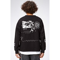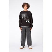 Rube is een zwart shirt van 100% biologisch katoen met een witte print en lange mouwen. De print is monochromatisch en heeft een collagestijl met een muzikaal thema met old school draagbare speaker, breakdancers en elpees en een stoere ruimteraster. Rube heeft een ribboord bij de ronde hals en mouwen en heeft een ruimvallende pasvorm.