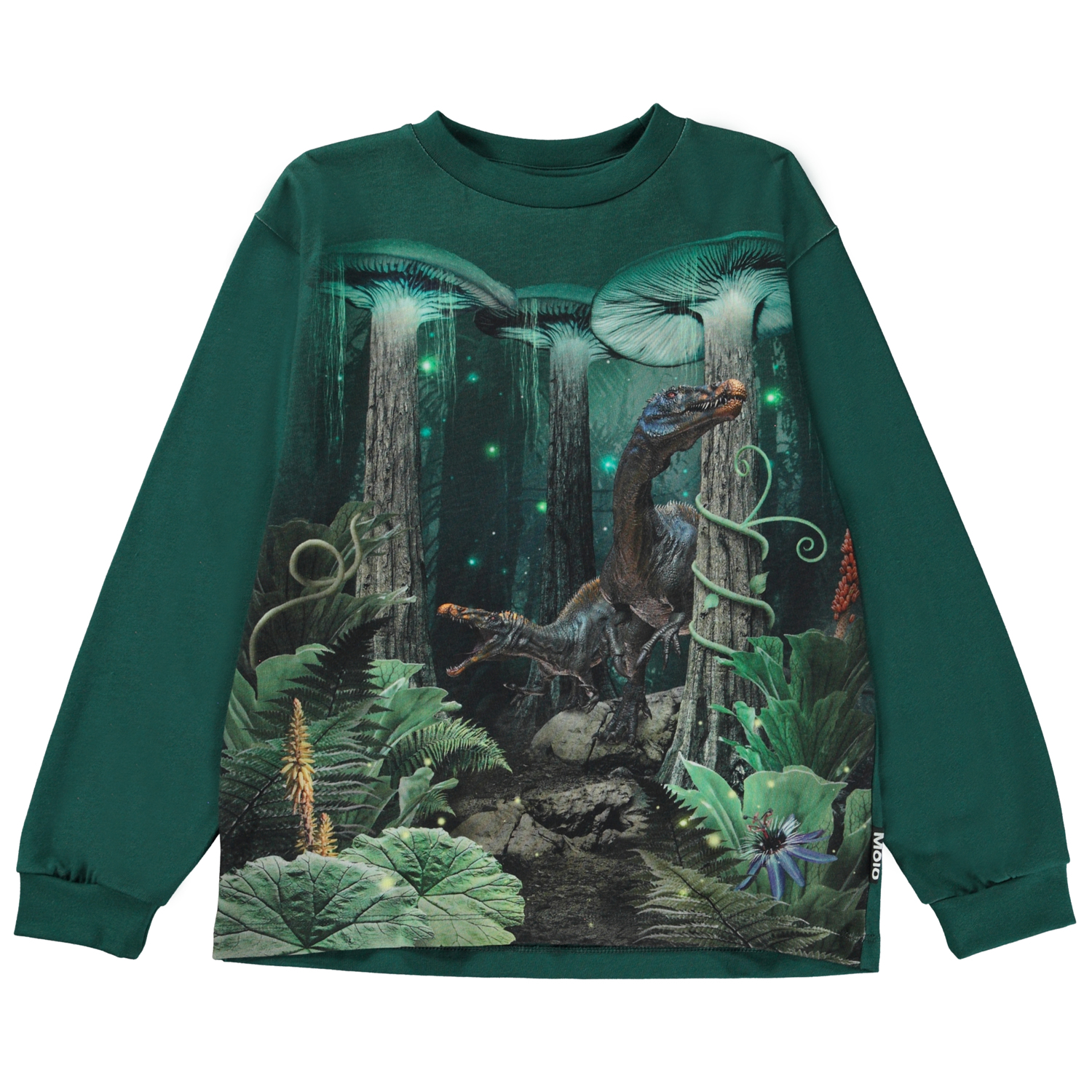 Donkergroene longsleeve met op de voorkant een print. Op de print staan van fantasie wezens uit de verre toekomst die ronddwalen in een magisch bos. Gigantische, lichtgevende paddestoelbomen en vuurvliegjes verlichten het tafereel. Twee dinosaurussen zoeken onder de paddestoelen naar eten. Deze longsleeve is gemaakt van 100% katoen, heeft een ronde hals met ribboord en ribboord aan de mouwen. Het heeft een ruimvallende pasvorm.