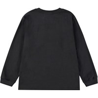 Zwarte longsleeve van biologisch katoen met een ronde hals en geribbelde manchetten. Het heeft een ruime pasvorm en een print op de voorkant, waarop een astronaut te zien is die een buitenaardse planeet verkent. De vraag rijst, is het echt zo buitenaards? De print bevat ook de tekst "Out There".
