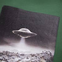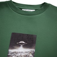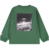 Donkergroene longsleeve gemaakt van biologisch katoen met een ribboord rond de hals en mouwen. De longsleeven heeft een ruimvallende pasvorm met een print aan de voorkant en achterkant van een UFO die schijnt op de maan.